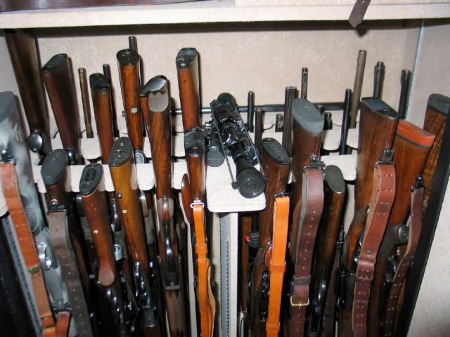 However, that problem doesn't occur with SxS's. They go in muzzle down and fit perfectly. Also my bolt actions and longer barreled guns can go muzzle down. The front row is left for using guns, muzzle down. I removed some scopes for convenience.