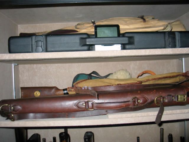 The upper shelves hold small guns like Favorites, a short (18") lever and cased SxS's.