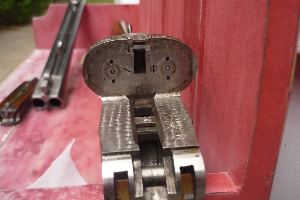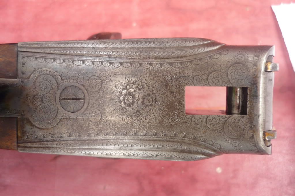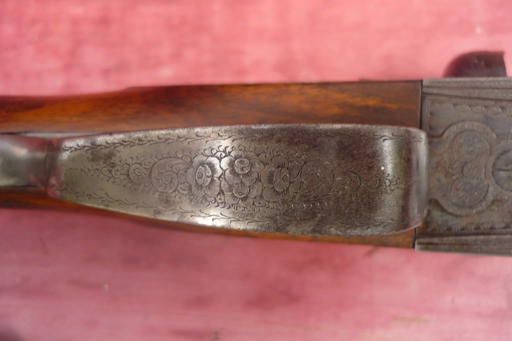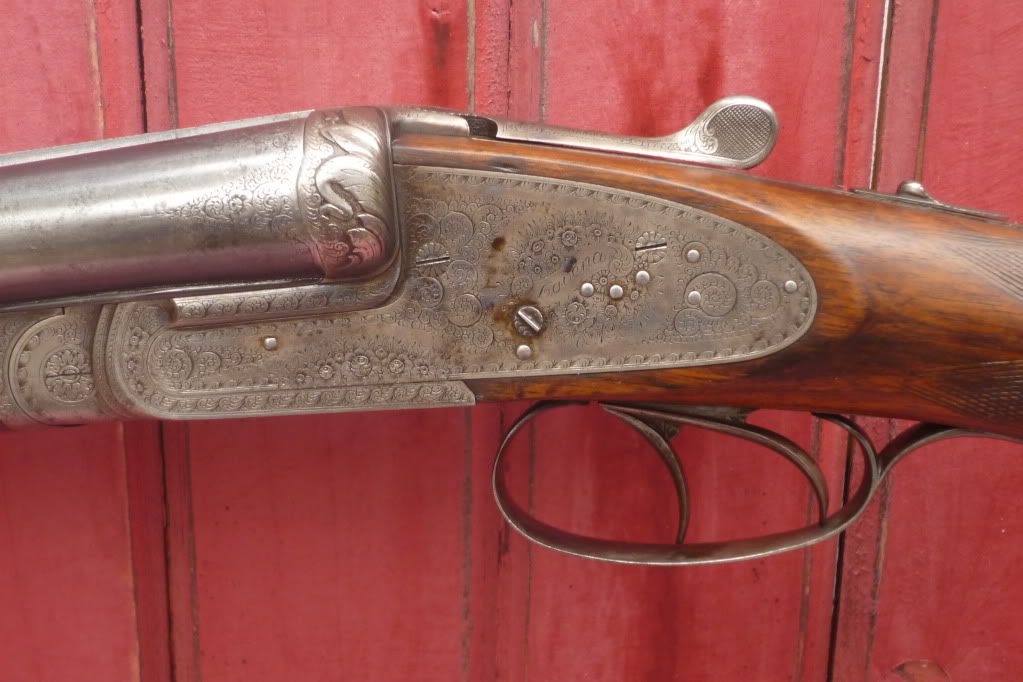 Finally have some pics of my Lovena Here are some details in addition to the photos: -bar action side lock, with gold plated lock internals, cocking arms, ejector hammers -12g. 2 1/2" chambers -28 1/4" barrel length, bores in very good condition -.026", .026" chokes -Double trigger with front articulated trigger -13 3/4" Length of pull -ejectors -double Purdy underbolt locking with third sliding bite -bushed firing pins -cocking indicators -rose and scroll hand engraving -gold oval in stock -horn butt plate -screw slots in very good condition -engraved barrel sling swivel base -tapered rib           [img] http://i267.photobucket.com/albums/ii296/JAMESROBLIN/guns/Lovena/LovenaBarrelFlats1.jpg[/img]