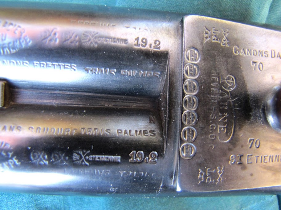 Here are some photos of the newly found 10 bore that is actually a P 17 not a V series: Additional info: It is in 99% condition. The barrel lengths are 68 cm. DAC is 1.5" DAH is 2.625" 70 mm chambers Trois Palmes proofing Right barrel marked Sans Soudure which owner assumes means no choke. (Sans soudure is "no solder", maybe Ted can shed some light on this) The left barrel is choked but he has not yet been able to determine the actual choke. Bores are marked as 19.2 mm Mid 20's serial # purchased new in 1930 Apparently built in 1926 Very nice!!! JC (acting as picture poster)