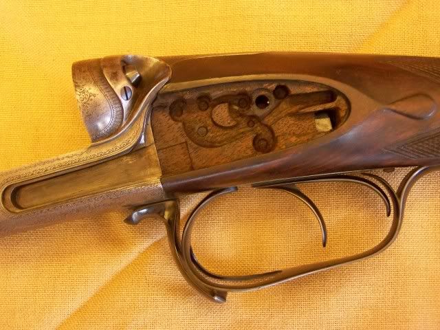 Just got back from a very wet and rainy grouse hunt, the last of the season. I had to take the guns down to the bare guts to make sure they dry out properly, while I had them apart I figured I shoot a couple of quick pics of some lock work and stock inletting. The first is of course a Chas. Lancaster Model A "Wrist Breaker". This is the best gun Lancasters made at the time (1890). Notice the locks are quite robust, but perfectley executed, as is the stock inletting. As a good English stockmaker friend of mine commented, "not particularly difficult to execute, but everything is spot on". Best Quality engraving...  Well put together locks, robust and simple. Notice how the hammer is filed and shaped..attention to detail, it didnt have to be done that way, it would've worked just fine being a slab. It took many hours at the bench to get the shape just right.  Stock inletting...as Paul said "Spot on"!   Here are some shots of a little 16 bore Chas. Smith, Newark-upon-Trent. The action is a 2nd pattern Purdey patent thumb-opener.   Stock inletting, extremely well done..