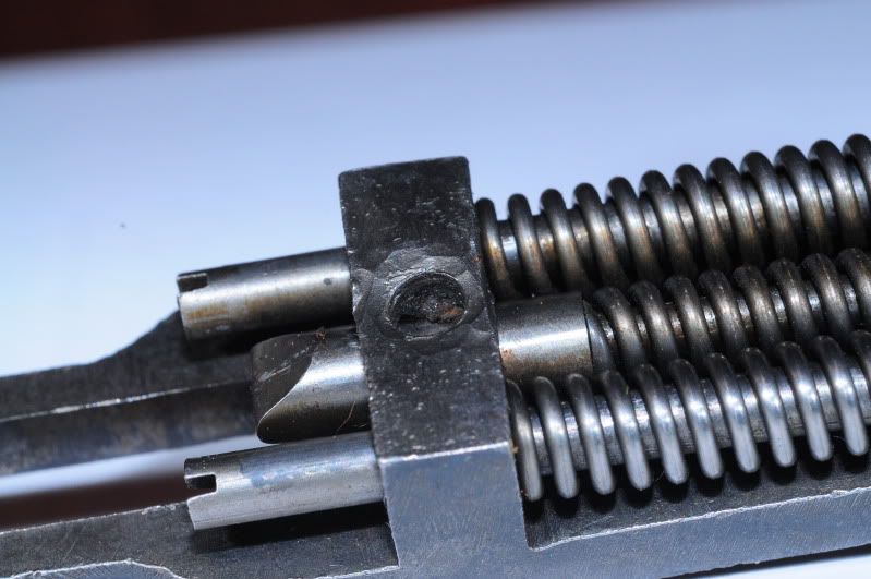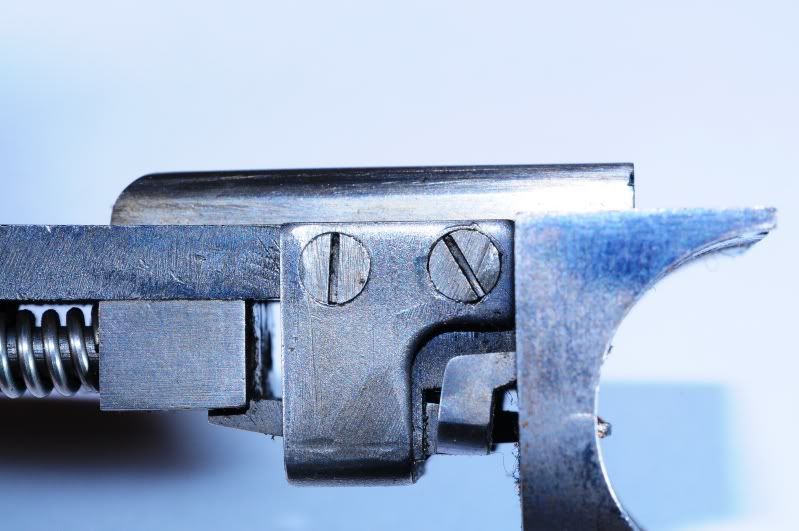 These pics of my forend iron from a 410 NID really were the first time I'd used two flashes in addition to my built-in flash. Same camera and lens as above. I was trying to capture some of the damage from a couple stripped holes and also the overall correct assembly. I think the lighting really caught the buggering up from a hammersmith pretty well. I'm in the process of repairing that, but that's another story.