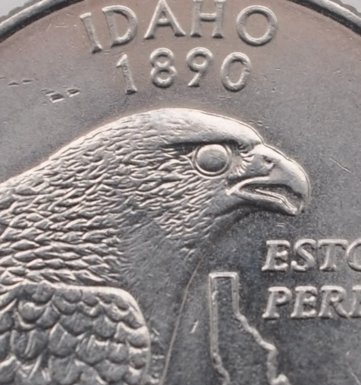 JDW, The Idaho State Qtr upset a bunch of folks here in the North part of the state. The Birds of Prey area is a short distance south of Boise. Many folks up here thought something representative of the whole state would have been more appropriate. I drug a couple of them out and I certainly can't see the detail with the naked eye that you show in the photo.