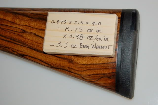 I love homework.  I weighed 3 fancy English walnut forend blanks and came up with an average of 0.38 ounces per cubic inch.  I've removed as much as 6 ounces. As I said, depends on the stock and how determined you are.