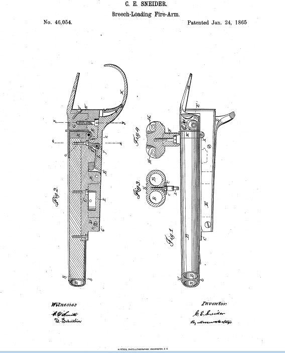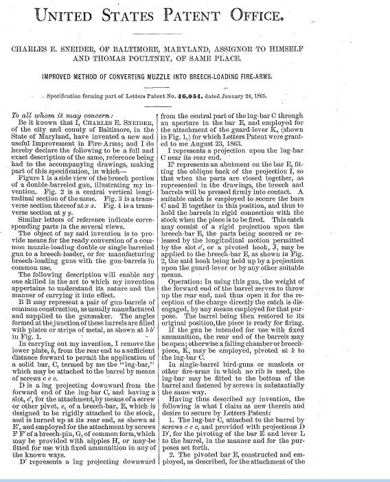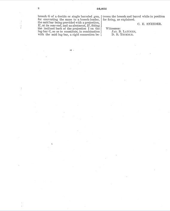Mike, take a look at Patent 46054, which is the patent marked Jan 24, 1865, on the underside of the barrels. This patent is for an improved method for making muzzleloaders into breechloaders. The patent drawings [Sneider's patent] are extremely similar to what we see in the pictures where a British proofed muzzleloading gun was converted to a breechloader.