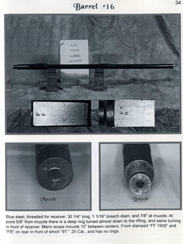 Even though the range is 30 miles away there is a airport just a few hundred yards away from it. I can log on the weather at the airport and check the wind and temp and if bad I stay home. I made some longer base-bands at .180" the ones I been making are .100" with the case OAL of 2.265". I also trimmed a case to 2.220" and with the longer BB it's a jam fit. The Sierra 75's will also chamber. I've been playing with other Mann-Niedner 25's for some time now and this barrel is dated 1909, the earliest one I have access to. Here is a picture of an identical barrel at Walnut Hill, the only difference is my barrel is also marked "F.W. Mann".