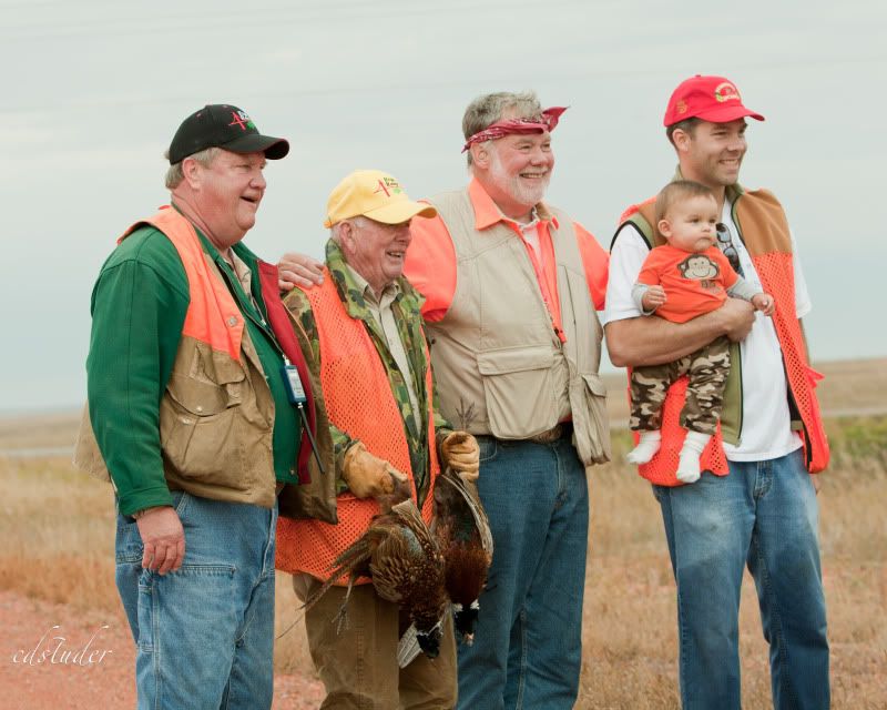 Here's a picture of last fall's Montana pheasant hunting. Left to right, Brad Studer a hops grower and hunter, Don Hardin , a board member, with the first two birds of the season in his 79th year of sharpshooting, myself, my son, Aron, with grandson, Jack Dean. This was Jack's first hunt, sans gun, since he failed his hunter safety course at age 9 months. Since then Jack has been along on quail hunts in New Mexico, and partridge hunts in Saskatchewan. All this in his first 19 months. I'm pretty lucky.
