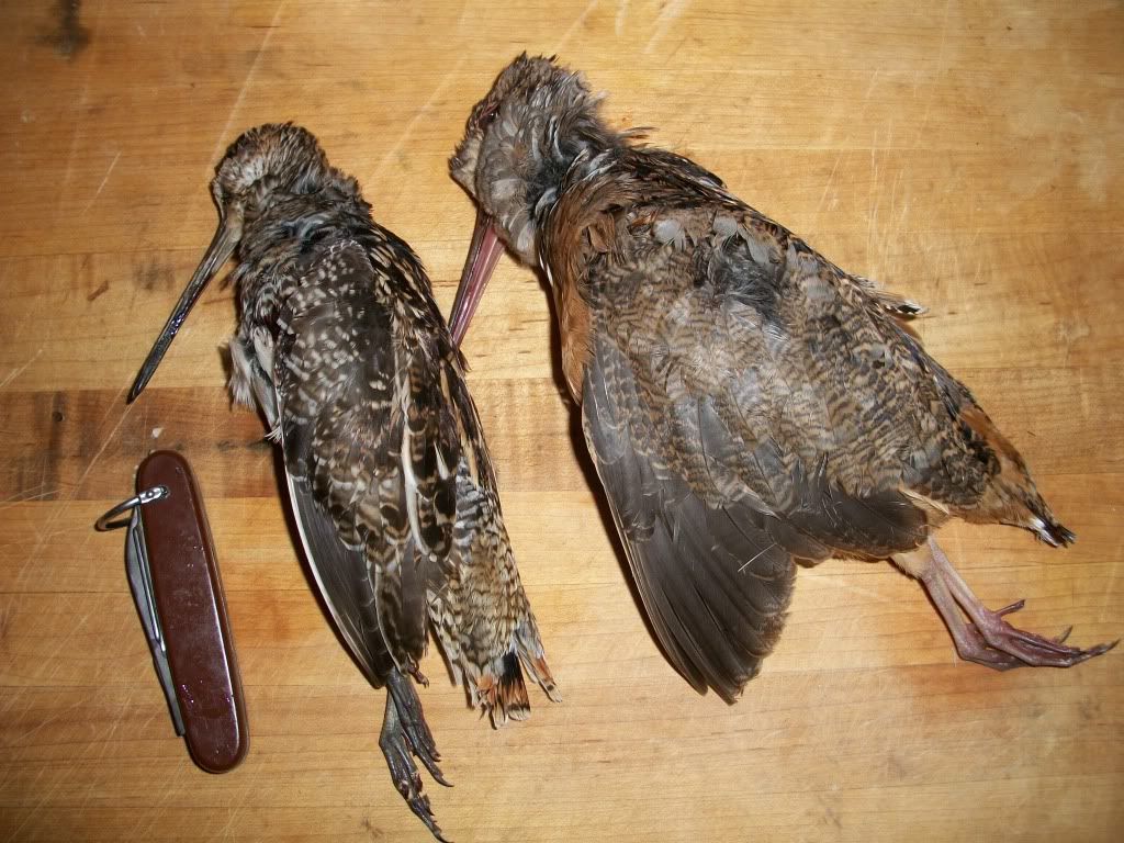 Always wonder when woodcock are discussed.Is it the"American Woodcock"- Philohela minor ,or the "common snipe"-Capella gallinago.Different species,but somewhat similar to many observers.They are of the same family-Scolopacidae. Given their differing preferences in food and feeding, habitat, cover, concealment, holding and flushing behavior, I'll leave the "how similar" to the observer.  NB: These were courtesy of a friend. He shot them on an epic day of mixed-bag bird hunting last fall, when he came up short on the "upland grand slam in a day" when he missed the grouse. He did get these, a nice cock pheasant, a turkey and a very befuddled dog.
