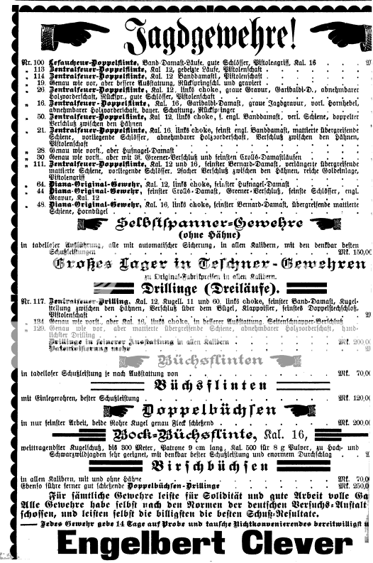 Like H. Scherping and other weapons handlers, Engelbert Clever had a cult like following of his wares and they described him as a hunting haberdasher as well as a top shot(2nd tier?) - Jagdutensilien Händler und Meisterschütze(zweiter) . He holds some sort of patent #3965 from December 28th, 1891 while located at Comödienstraße 3. And it appears by the adverts that by at least 1907/1908 he had passed the concern on to a successor. He too, or his clients, seemed to cotton to the eccentric breech of that of Collath.   Like to see the stamps on this one. http://www.gunbroker.com/Auction/ViewItem.aspx?Item=290373142Kind Regards, Raimey rse