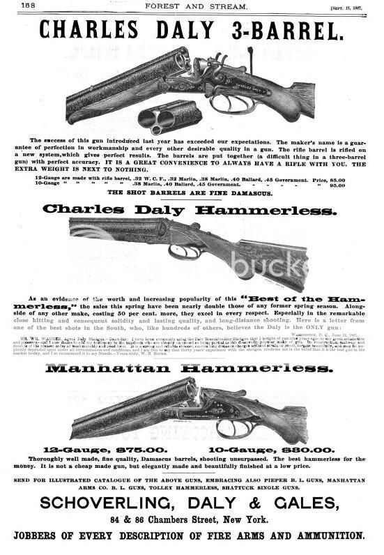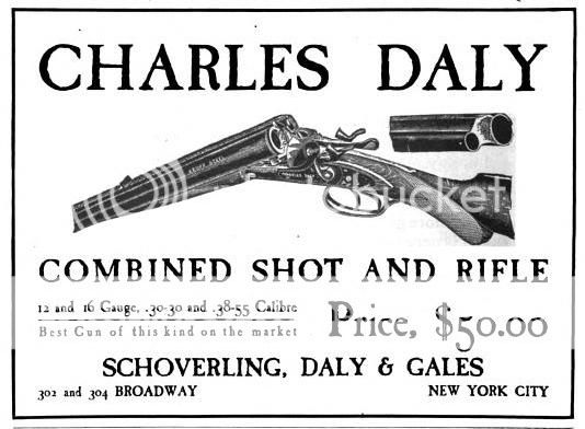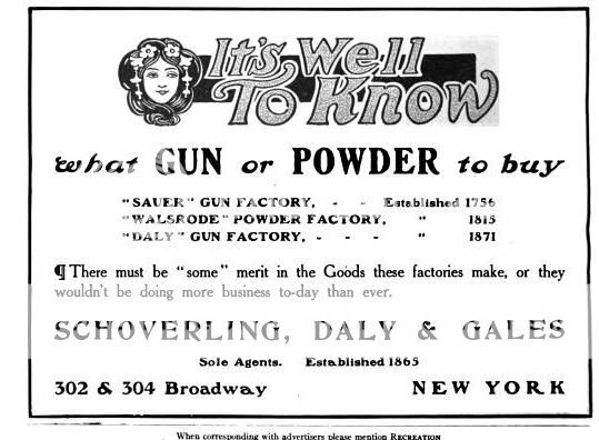 Schoverling, Daly & Gales adverts from 1905/1906 Recreation publication pushing Sauer's wares. Schoverling & Daly both have passed but the future looks bright as H.A. Lindner makes an expansion while his son Ernst Lindner(July 6th 1883 - June 16th 1915) should be wrapping up his efforts on his master gunsmith endeavour. But this Pullman sporting weapons train would be come to a screeching halt in 10 short years.    I think Daly's Combined Shot and Rifle examples to be few and far between?  Not the tube diameters are given.  My memory could have failed me but I don't recall seeing many hammerless Daly 3 Barrel sporting weapons?  But one could purchase an American version from the Three Barrel Gun Company for $65+. Kind Regards, Raimey rse