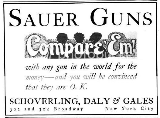 1914 Advert which seems to give similar weight to the Sauer as well as the Daly gun.  I think this is a 1911 advert but from the early 1900s to WWI S,D&G sales must have increased so that H.A. Lindner couldn't keep pace and Charles Daly turned to Sauer to fill the void. By the start of WWI, it is said that there were no less than 300 hammerless scatterguns & bolt guns(I assume some were Dalys or Daly guns but who knows) on hand to handle and drool over. So it is very possible that S,D&G were looking for a lower priced hammerless Sauer gun and set the wheels in motion for the Sauer No. 0 but acquiring parts kits from Liege and then peddling the final product and that is how the odd Sauer triggerplate actions landed on these shores. Anyone know of a copy of their 300 +/- page catalogue? Kind Regards, Raimey rse
