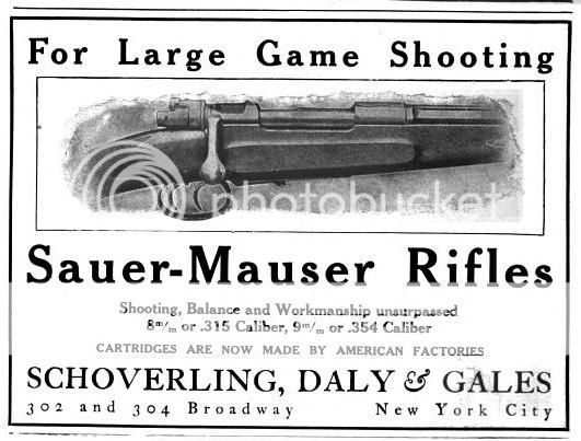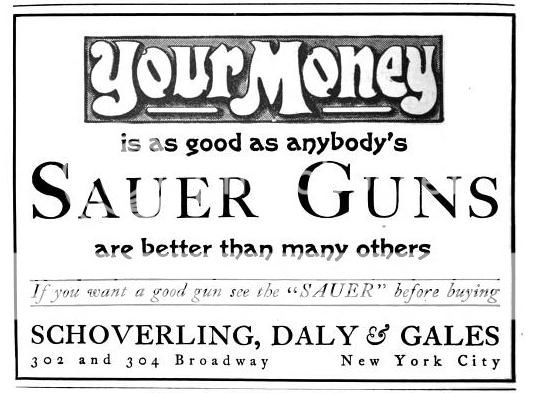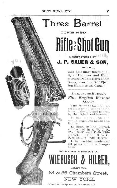 Ah, ha - from page 15 I found the info I had forgotten: "In 1868 Friedrich Wiebusch was listed as a silent or special partner and he expired in 1893, 2 years after August Schoverling. I'm fairly confident that Friedrich Wiebusch was founding partner in Wiebusch & Hilger(Hilger & Co. founded in 1848??) which arrived on the scene around 1876 and continued till say 1928. After Friedrich Wiebusch expired, Charles Frederick Wiebusch, William S. Hilger & M. Taussig were at the helm and were mainly blade peddlers. In 1892, about the time they were listed as the sole Sauer agents, they were in a tiff with the U.S. of A. over bowie knives, which they considered to be sidearms but the government didn't see it that way & they lost. The seem to have drug in some Belgian arms also and all appears to have left port at Antwerp." So, I really need to sort thru the chaff and condense the clutter. Even if SD&G were founded earlier than 1865, the War of Northern Aggression was in full swing so they could have been peddling but few would have know about it.  Recreation 1905 advert Interesting to see the founding date of the Suhl factory. Kind Regards, Raimey rse
