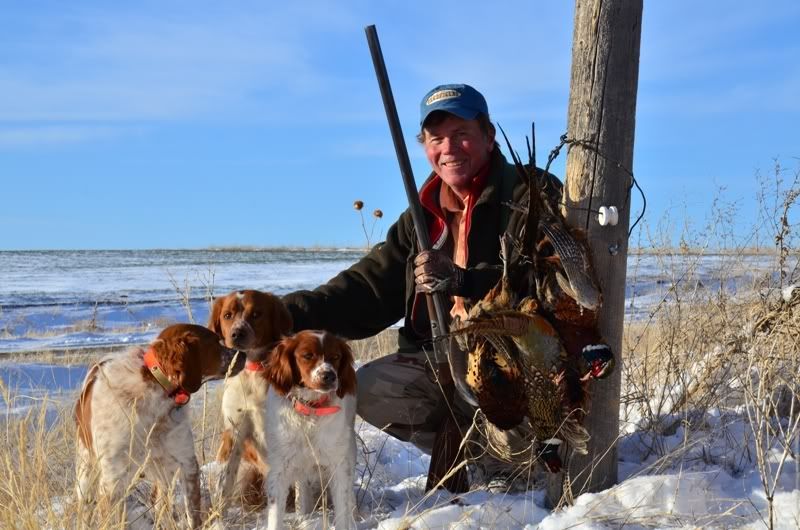 Last year I drove to Kansas and instructed Last Dollar, Joe Wood, Chuck H, SKB, and Daryl Halquist in pheasant hunting. That is Belle, Red, and Ginger. Molly was so exhausted she wouldn't stay in the picture but kept loading up in the truck. My shooting student Chuck H. took the picture. That is a Parker VH12, 32" barrels choked full and full and weighing eight pounds. A light sixteen would have done as well.