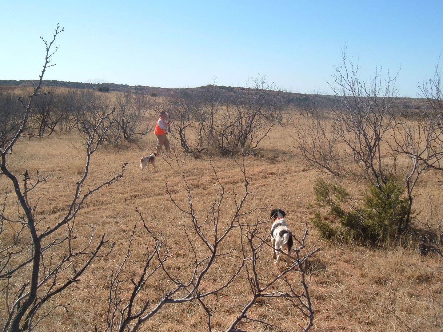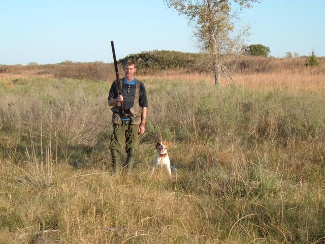 Here is Joe Wood going in to flush a Bird Belle pointed. Molly backing. On Joe's family place near Lubbock:  My Friend Chubby's German Wirehair. Obviously a versatile breed:  Red and Bell perform synchronized shaking after a dip:  Took this while Blue Quail hunting near Deming, New Mexico. Oddest thing, there a a house size rock at the base of the mountain and a spring bubbled up right in the middle of it. Got up a covey of seventy or eighty Blues right next to it:  Field trial in Amarillo a couple of years ago. The gun is a very nice Fabrique Nationale twelve with 26" barrels, weighs 6lbs 2oz. Me and Red, taken by the lovely Leia:   Fox A Grade sixteen. Weighs 5 lbs 9oz, 26" barrels:  Fox XE sixteen:  My son Taylor and Beau. Taylor is holding his AyA No 1 twenty, 30" barrels 5lbs 14oz.  Ithaca Flues Grade 4 sixteen, 28" barrels, a magic wand