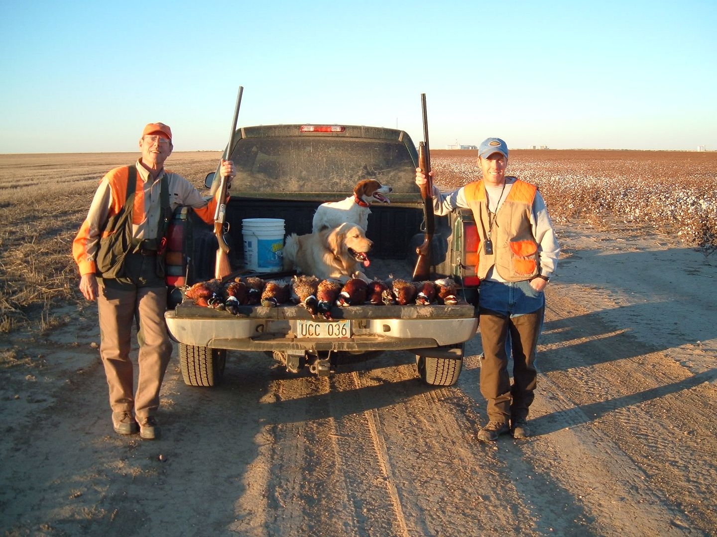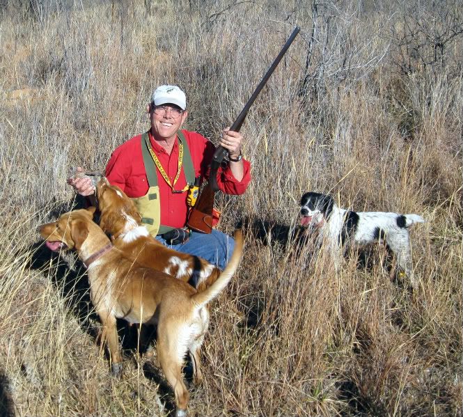 Here is Joe Wood going in to flush a Bird Belle pointed. Molly backing. On Joe's family place near Lubbock:  My Friend Chubby's German Wirehair. Obviously a versatile breed:  Red and Bell perform synchronized shaking after a dip:  Took this while Blue Quail hunting near Deming, New Mexico. Oddest thing, there a a house size rock at the base of the mountain and a spring bubbled up right in the middle of it. Got up a covey of seventy or eighty Blues right next to it:  Field trial in Amarillo a couple of years ago. The gun is a very nice Fabrique Nationale twelve with 26" barrels, weighs 6lbs 2oz. Me and Red, taken by the lovely Leia:   Fox A Grade sixteen. Weighs 5 lbs 9oz, 26" barrels:  Fox XE sixteen:  My son Taylor and Beau. Taylor is holding his AyA No 1 twenty, 30" barrels 5lbs 14oz.  Ithaca Flues Grade 4 sixteen, 28" barrels, a magic wand