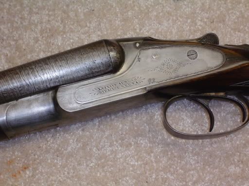sidebyeach; does your gun have the 1907 patent date on the trigger plate? Per the SN, estimated date would put it as an '06 gun. Also note the different appearence of the closeup view of bbls on doubletrouble's H grade & those on his earlier posting of the GE. Lefever catalogs as well as other gunmakers of the era all refer to those on the H as "Twist" & those on the GE as "Damascus". With the 2 numbers on the steel bbls it probably was added later & I would bet the straight grip is either a modification or re-stock.