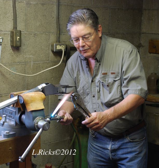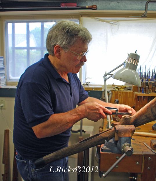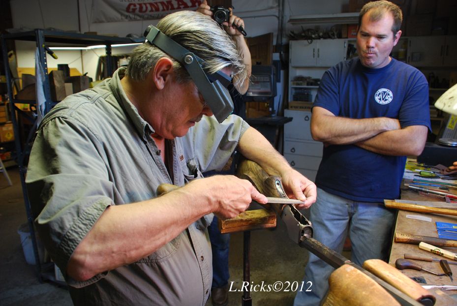 Steve is the guy holding the torch. His long, lost third cousin by marriage from Oklahoma Nick Hughes brought the High Wall project and did work. Nick is owner of J-S Machine, a quite accomplished custom metalsmith and a more that competent craftsman.  Rasping the grip to the finished tang  Robert beginning his first skeleton grip cap installation. Note the precision tool...