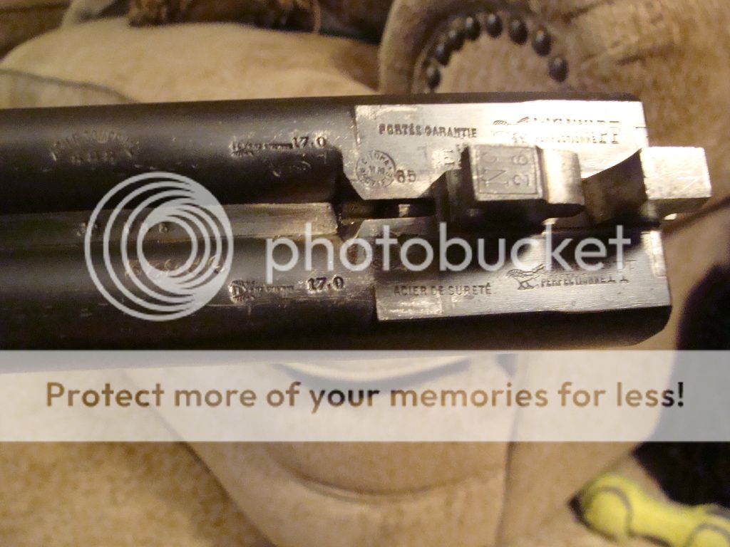 Lots of nice French phrases as well, but most are basically meaningless--more like advertising than anything else. The range is guaranteed (but they don't tell you what it is). The choke's been adjusted (but they don't tell you what it is). And the barrels are made of "safety steel", whatever that is. Looks to be your basic French guild gun, which--as noted above--is not bad news at all, but rather good news because they're pretty solid products. You may find that trigger pulls are quite heavy. That, in addition to a whole lot of choke, is perhaps the major problem I've found with vintage French doubles.