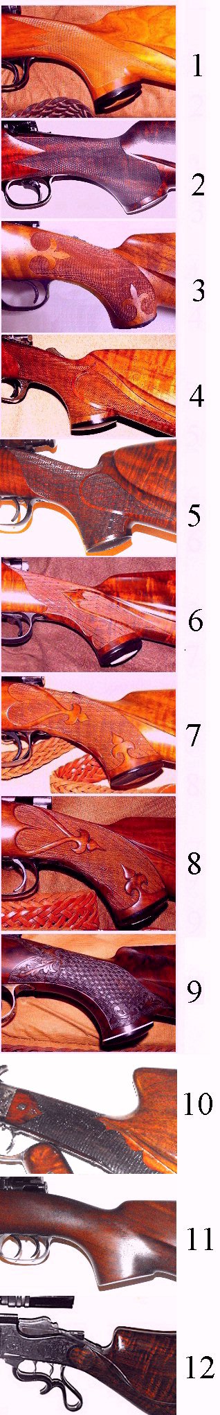 I have collected a dozen or so Leonard Mews rifles over the years, including Rifle No. 10 that was Leonards personal Schuetzen rilfe. These rifles have various checkering patterns and styles. One 22-Varminter (no.11) was made for Leonard's friend and has no checkering. Rifle No. 12 is described and shown in Dunlop's Book on Gunsmithing, (page 542 & 630) as having been made for Colonel Clifford (Christy) Christopherson. Rifle No. 4 was a joint effort between Leonard and Nubbs Fashingbauer of Lac du Flambeau, Wis. and engraved by Arnold Griebel. Rifle No. 1 has the name "George Hayes" (Gabby Hayes) penciled in the barrel channel next to Leonard's name stamp.