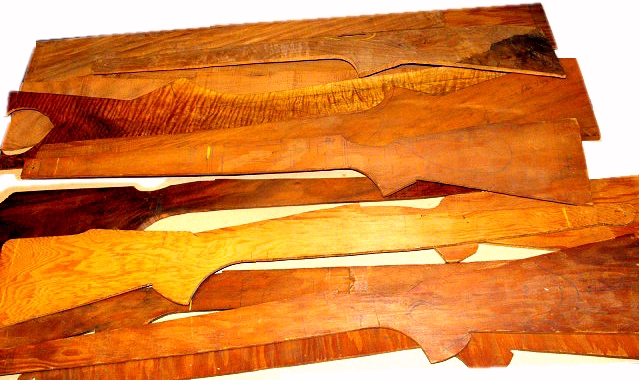 I was fortunate to have been given many of Leonard's stock patterns that he used for his "repeat" customers, including the pattern for Dr. Smith's rifles. Many times these patterns were "slices" off the stock blank when it was rough shaped and it has the the customer's dimensions penciled on them. And, a few of the patterns were little more than a plywood cut-out of the rough shape, traced from the finished stock, also with customer's dimensions penciled on them. One very long pattern for a manlicher stock is made of two pieces of plywood, stapled together in the middle. (third from the bottom in the picture)