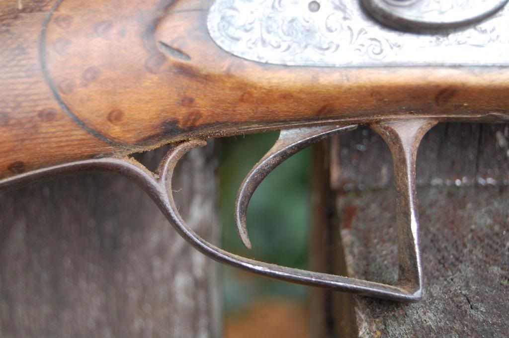Moving on to the trigger guards this is a photo of one of Perrins early percussion singles with a birds eye maple stock.