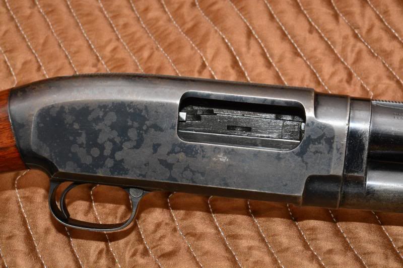 I'm not sure of the grit he used. It has a nice low luster. Maybe a 280-320 grit on the receiver and the barrel looks more 150-180 grit, following the OEM finish. The stock set is going to be a "Skeet" set, exhibition wood, Skeet type point pattern. Some "before" pics