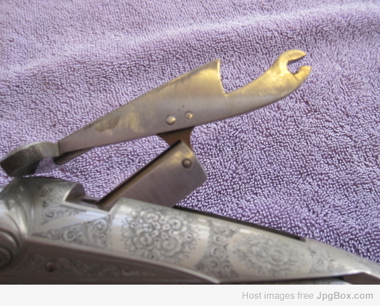 This last photo shows a view of the axle (tip of pen is pointing at it) and the main spring, in the bottom of the opening lever, the tension of which you overcome when pulling up on it. That spring is the heart of a V action Darne, and the gun will be useless if it breaks, so don't be tempted to jam any tools into the breeck block to pry on it. Assembly is just the reverse of what you just did. Be careful to line the slot on the opening lever up with the axle once you get the breech slid back on the rails, and push down firmly on the opening lever until you hear a nice little "click".