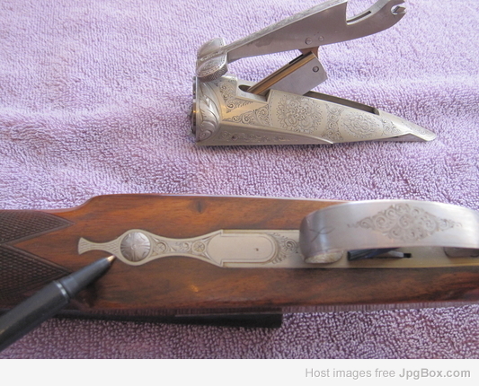 This photo shows the breech removed from the V action, and the pen is pointing to the button that must be depressed and held while dismounting the barrels. The barrels on any version of a Darne are an interference fit, and you must break that tension to remove them. The guys at the factory have a piece of masonite hung on a verticle wall near their bench, and just jam the muzzles into it while holding the button. It sounds brutal, but, they aren't hitting the buttstock that way, and don't risk breaking the toe of the stock by hitting it with a karate chop while the muzzles are in carpet or the tip of a shoe.