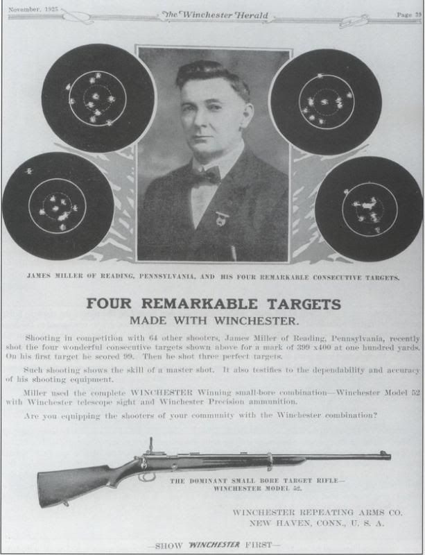 Finally remembered I had this. 1925 ad showing 4 targets shot at 100 yards by a James Miller of Reading, PA. He scored 399x400.