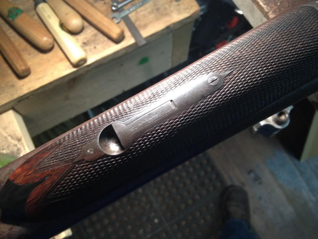 The wood to metal fit is pretty nice too The initials in the shield are EMT Jr - wasn't there a guy from Chicago...? And for anyone who has ever checkered, the checkering wraps around behind the trigger guard tang just like it does at the top - no divider lines. Again, nearly perfect execution.      top rib: