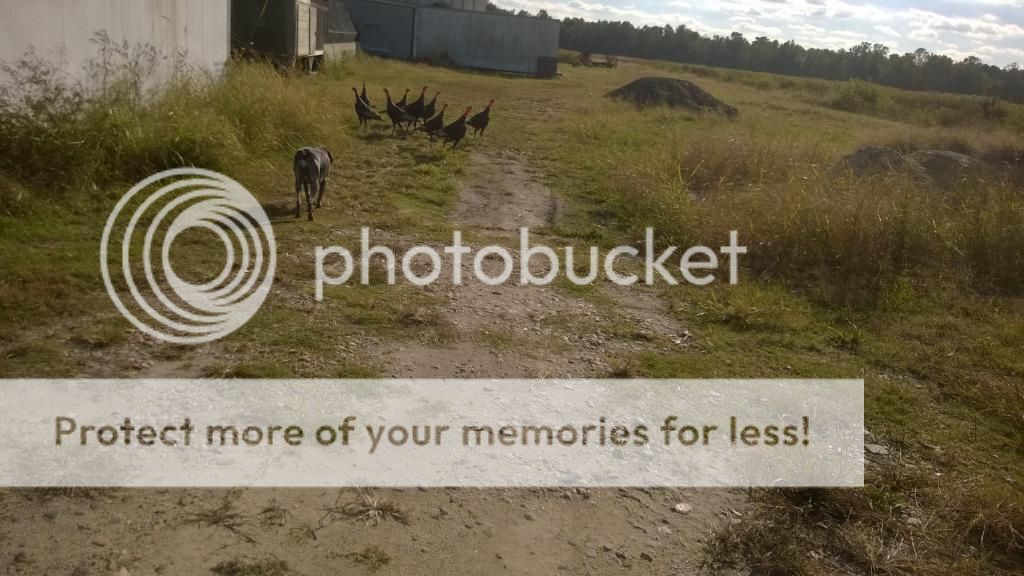 Stopped at a friends place today and while talking the dog acted birdy. I pulled out the camera and we walked around an old container into a group of Jakes. the dog and turkeys froze long enough to snap this
