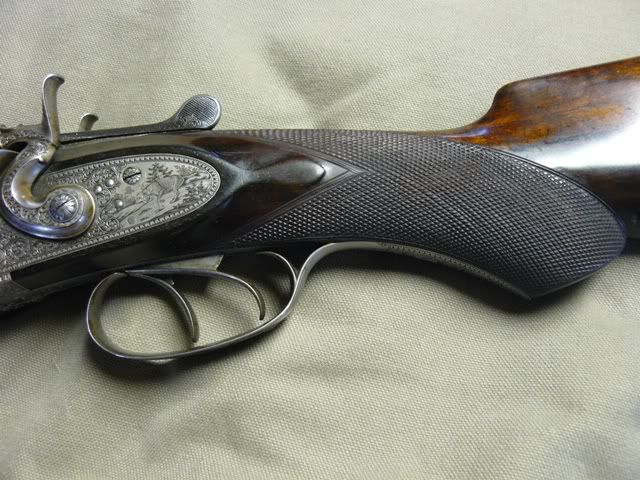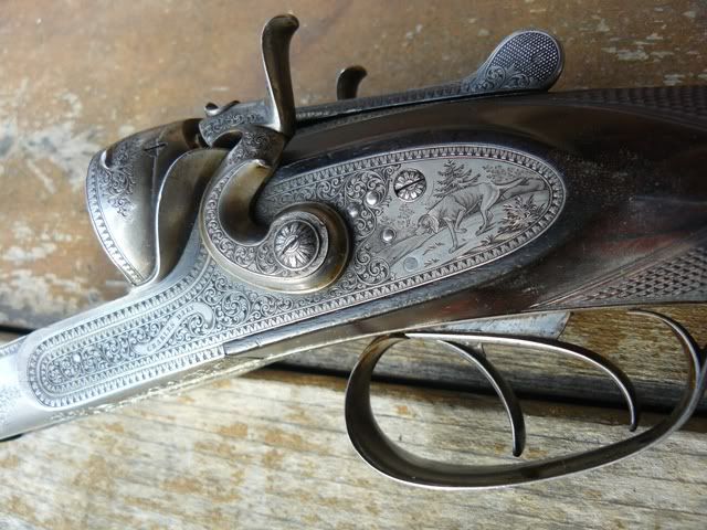 I'm pretty sure mine would be dated around 1871 with parts sourced in Birmingham and assembled somewhere in Germany. Smells like a Lindner but we will never know. Brazed barrels! Scott's (?) serial number 15,251 all over it. Oh, the scroll extension on the guard was not original--I've since removed it.