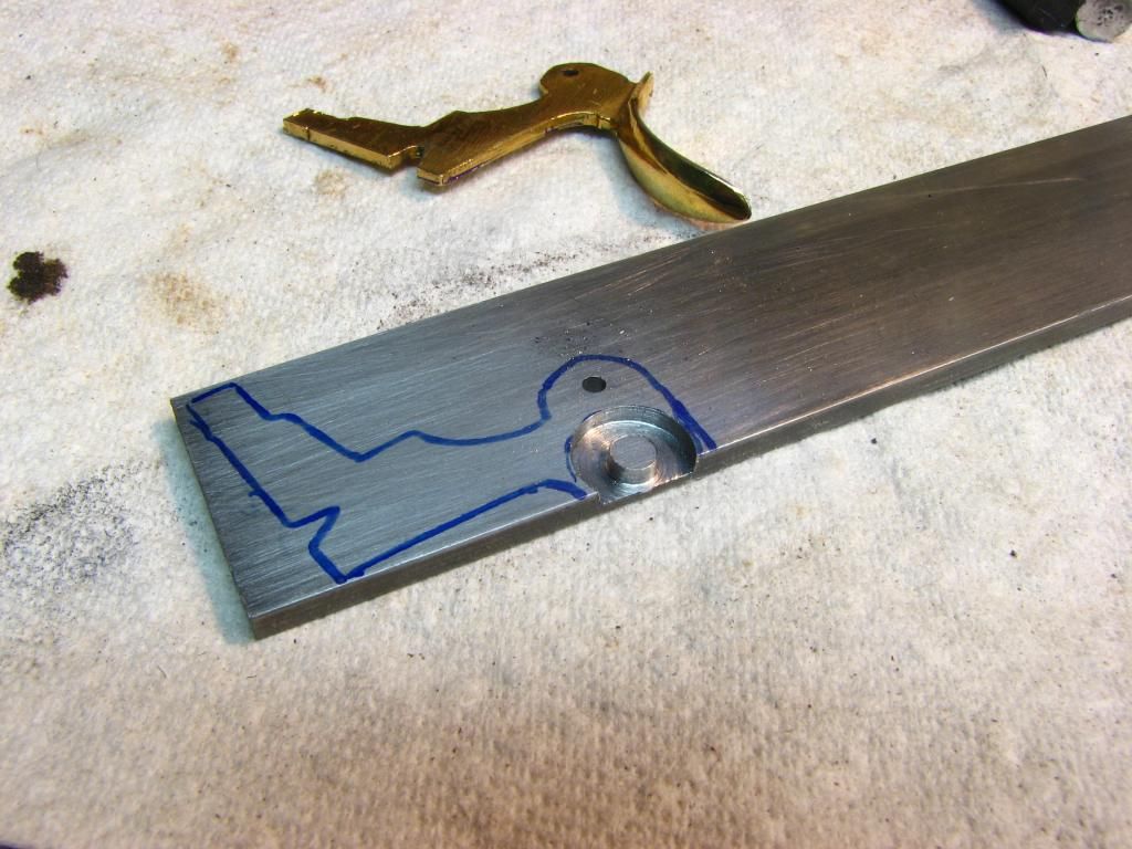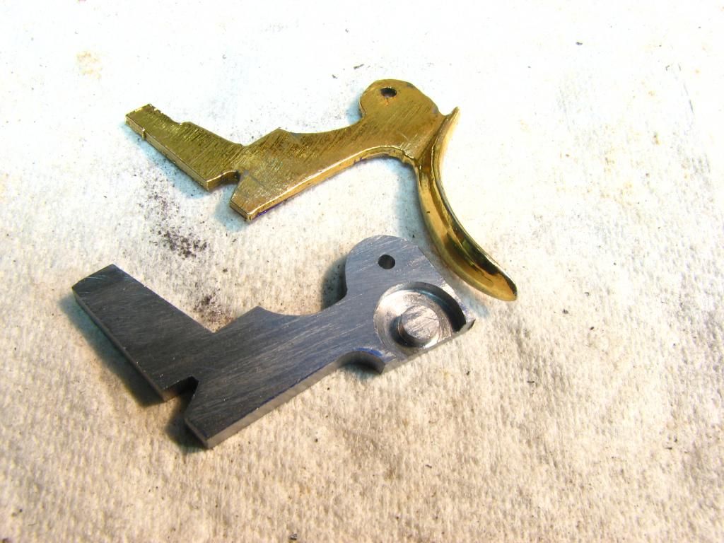 This gun will also have an articulated trigger. Here are some photos of the fabrication. I did cheat and used a ready-made screw to retain the spring.