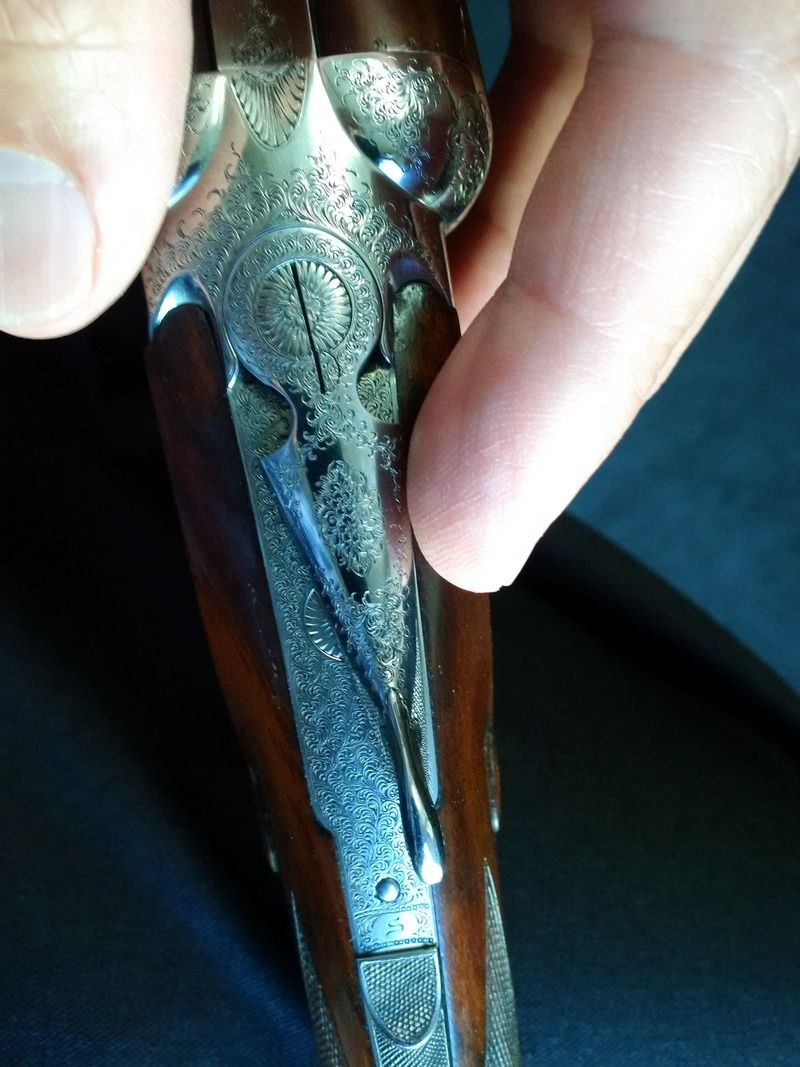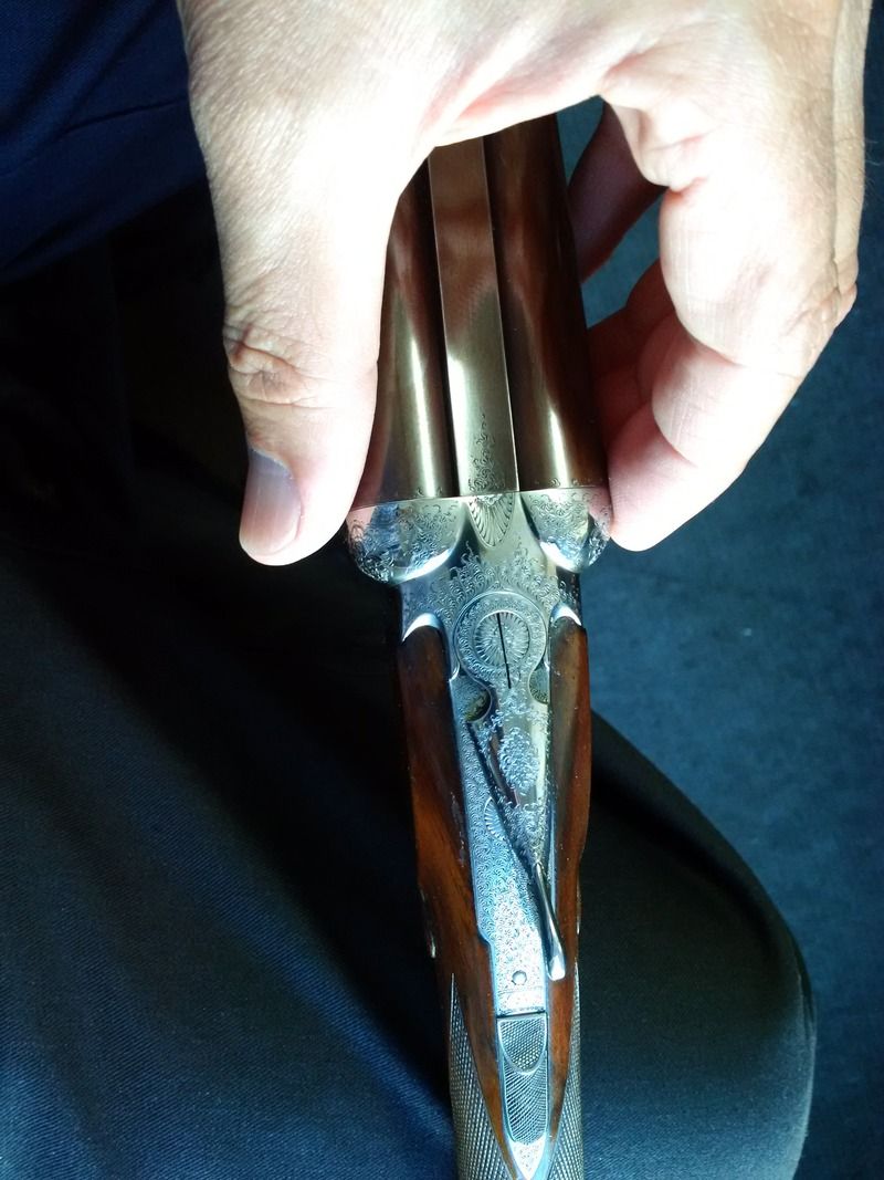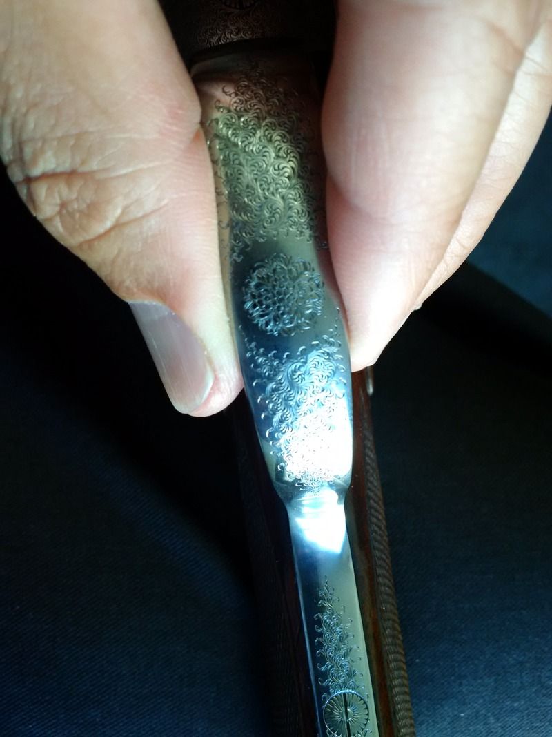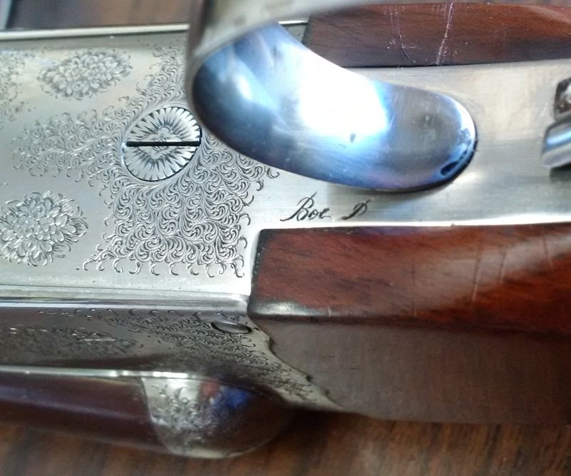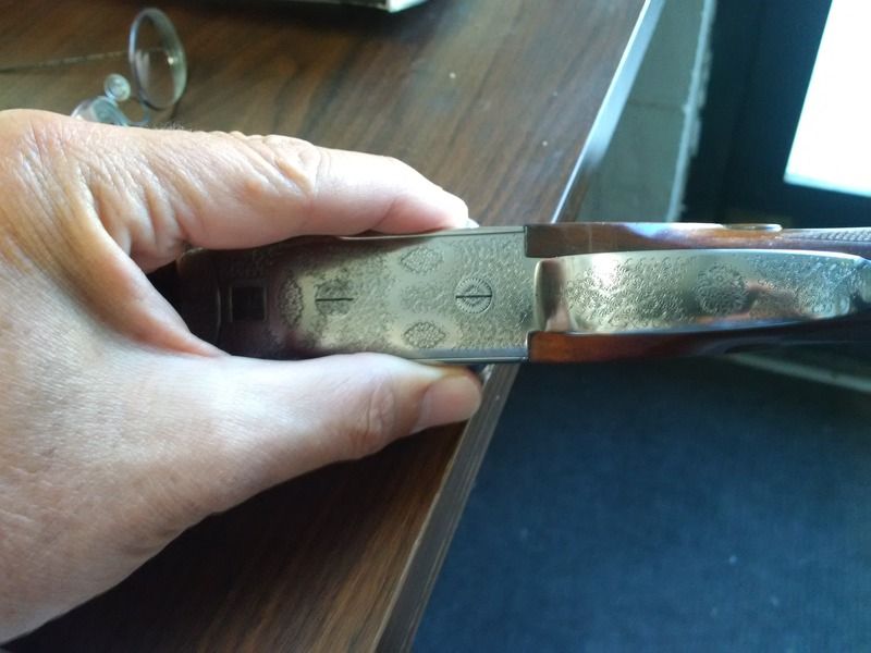 I had a look at the gun in hand today. I can't get over how small the action is. I took some pix in my hand. At 5lbs 6oz, the balance feels much more appropriately forward weighted than my 28" 28ga Repro, which is within 2oz of this gun. The Ferlib swings like a heavier gun. Not wippy at all. I think I'm really going to like this one. The chokes are .021/.013. or F/M, with tapers around 5" long and no straight section. The barrels are moderately worn plumb colored. I assume they were plumb colored from the factory. The stock looks like it's had a rough life. Plenty of little dings. Looks like a second over-coat of a finish on the stock as well. I'll shoot it a season and see if it's a keeper. If so, the stock will get a refinish in a traditional style. The barrels will probably get a blue/black finish, as this is my preference.     Engraving signature?