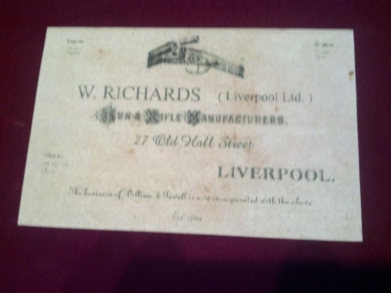 I will have to apologize for the quality this shot, but it is an example of a later trade label with the Liverpool address. This gun was a very petite .410 double that came through the shop as a transfer.
