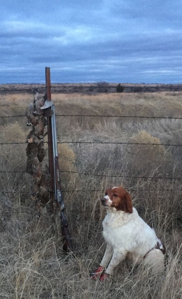 Thanks Stan. I am a lucky rascal. Went by myself today. Had a great day. In the thirties most of the day with a 30mph wind out of the North. Scenting condtions, amazing to me, were excellent starting about 1:30. The puppy ground tracked a single two hundred yards before the bird stuck and she pointed it, at 25 yards. Some very good dog work today. Ran five year old Ginger and fourteen month old Jazzy. My puppy Jazzy made a bird dog in the last couple of weeks. But she won't pose for pictures so Ginger is the only one in the shot. The gun is a Fox XE 20 gauge, about 5-1/2 pounds with 26" barrels, factory Kautsky single trigger, choked 5/1000th and 5/1000ths, 14-1/2 x 3 x 1-3/4, POW grip, leather covered pad. The single trigger has operated without a hiccup for several hundred rounds.