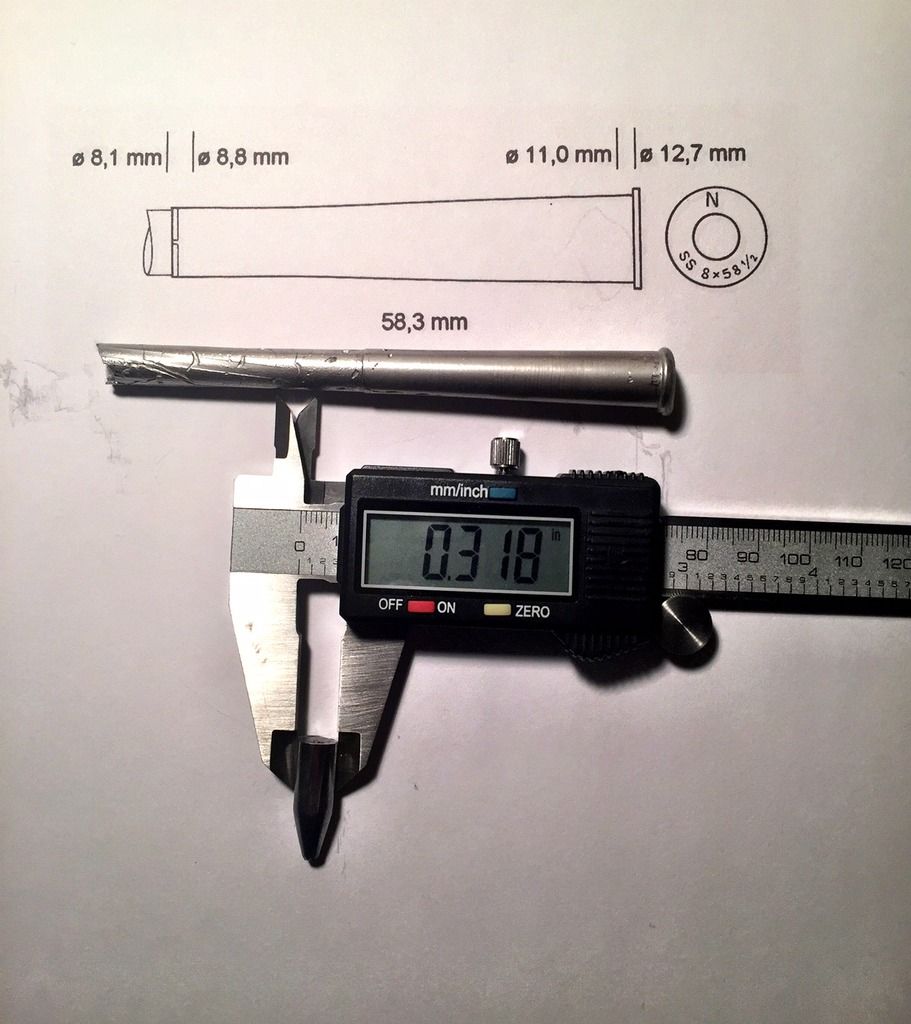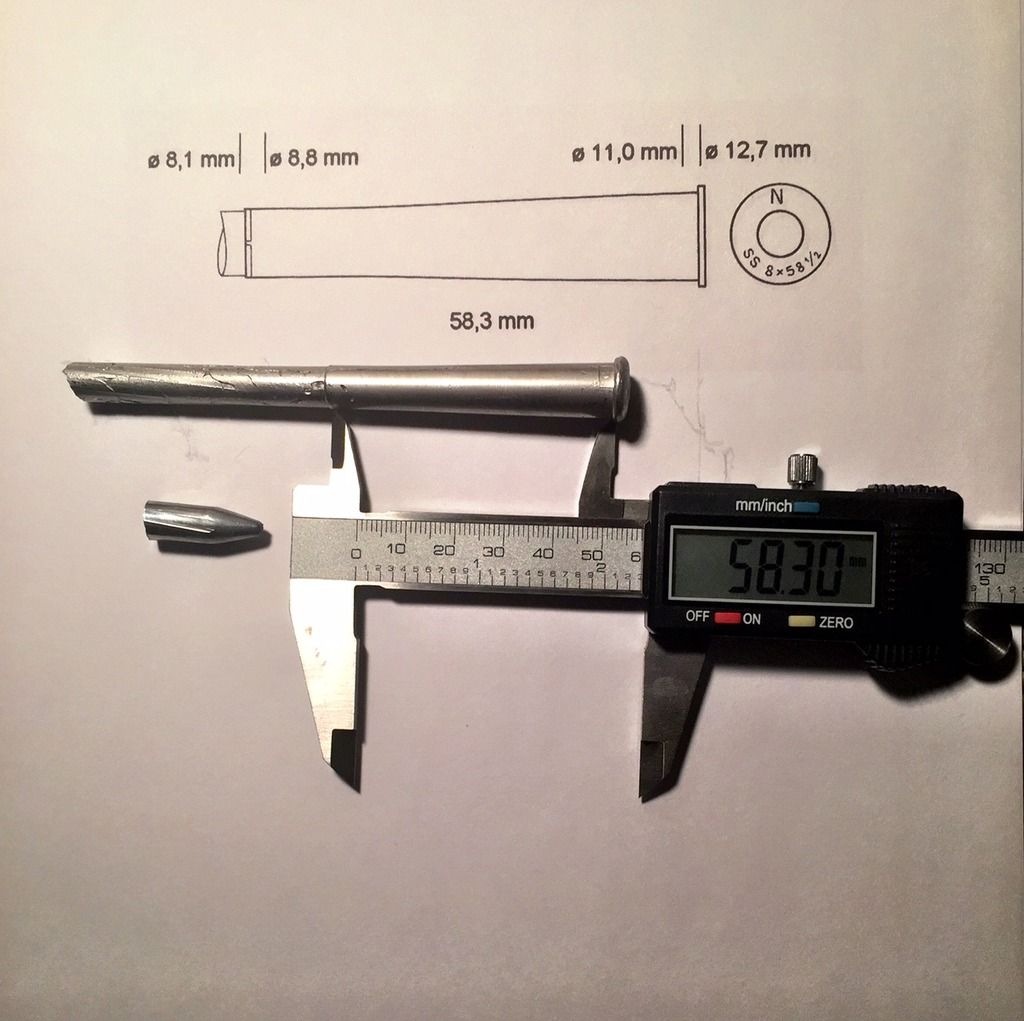 Hello Forum Members. I was able to do a chamber casting today. Based on the casting measurements and the research I did, it appears the gun is chambered for the 8x58R Sauer cartridge. I have attached 2 pics of the chamber casting. As always, I appreciate your thoughts and comments. BillK