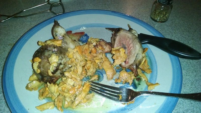 Lloyd, apologies for hijacking thread, but I'll keep the ball rolling until you get home.  Until last year I always gutted birds the day of the hunt. Two years ago, I either read somewhere or was inspired through a flash of pure laziness that freezing birds intact kept them fresher by better protecting them from freezer burn. I understand the argument in favor of immediate gutting. However, bad juices from shot wounds are already in the wound channel and freezing them in place would not worsen the effect. Thats been my experience with woodcock the past two seasons. I took a pair last weekend to Floyd with some fresh chanterelles and he was amazed at the freshness of flavor of the birds. I only freeze woodcock intact but see no reason not to do other birds the same way other than the storage issue. Geo, I dont parade dead birds in front of my wife and the frozen woodcock are kept in a cardboard box inside the freezer which keeps them out of sight and also prevents odd shape frozen objects from falling on my toes when I open the door. I appreciate some aspects of French culture, especially French guns, but cooking the birds with guts intact is not an aspect of French culture that I share. Julia was in town last week and I thawed out dove and woodcock for her smothered in fresh wild chanterelles. She Bogarted the wc and chants and I ate the dove. She raved about them. I rarely breast dove and like to cook them whole, plucked and drawn. Heres a photo showing the relative size of each. The dove were late October and the WC, January. I flash cook the birds on high, indirect heat on the grill. With lid down, the temps exceed 500 F. The dove cook to my satisfaction in 5 minutes and the wc, 7. I rigged a vertical roaster out of a wire coat hanger which holds 4 birds. Here are two wc I cooked earlier this month. Note the color of the cooked wcs flesh.