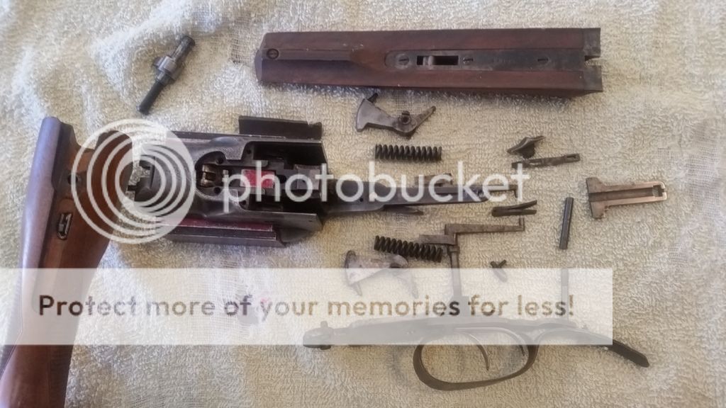 I laid out the parts and most of the action is here. The top smap, linkage and bolt are installed as are several other parts. I don't find the hammer spring plungers and the pin that holds the sears in. The sear springs are installed. The safety linkage parts are in the buttstock. The small pin that holds the safety button is missing. The two small screws that lock the hammer pin screws are also missing. I have the J hook and scew that fit on the barrel lug. The trigger plate assembly appears complete. There is a pin about 1" long and 1/8" in diameter that I can't figure out if it goes with the action. It looks like it's new. (Just above the rear tang screw in the picture.)