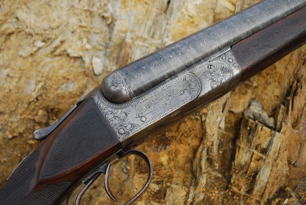 Wilkes-Barre -- They were only in business for a short period of time in the early 1890's. When the Parry Fire Arms Company failed in Ithaca, NY, in 1891, the machinery, patents and parts went to Wilkes-Barre. Wilkes-Barre assembled quite a few Parry hammer doubles and put their name on them, and also made a hammerless double using Joseph Tonks patents #333,795 granted Jan. 5, 1886 and #514,574 granted Feb. 13, 1894. The hammerless guns were made in four catalogued grades -- Grade A, $60 list, with twist barrels, 10- and 12-gauge -- Grade B, $80 list, with fine Damascus barrels, 10-, 12- and 16-gauge -- Grade C, $100 list; with very fine Damascus barrels; choice of full or half-pistol grip; 10-, 12- and 16-gauge -- Grade D; $125 list; with extra fine Damascus barrels; 10-, 12- and 16-gauge. The assets of the company were sold at auction in October 1895. There is about a page on Wilkes-Barre in a McIntosh article in Volume Two, Issue 1, of The Double Gun Journal.