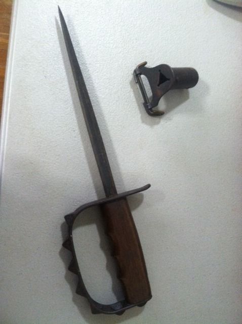 Stabbing knives eh? This one's not near as nice as Stan's and many of the others shown of in this thread, but my Granddaddy brought it back from WW-1 nearly 100 years ago. Its designed to pierce five layers of heavy wool clothing and still get to heart and lungs. The triangular stiletto blade is sharp on all three edges. Knuckle haft is marked U.S. 1917 LF & C. This one saw action:  Now that's a knife...Geo