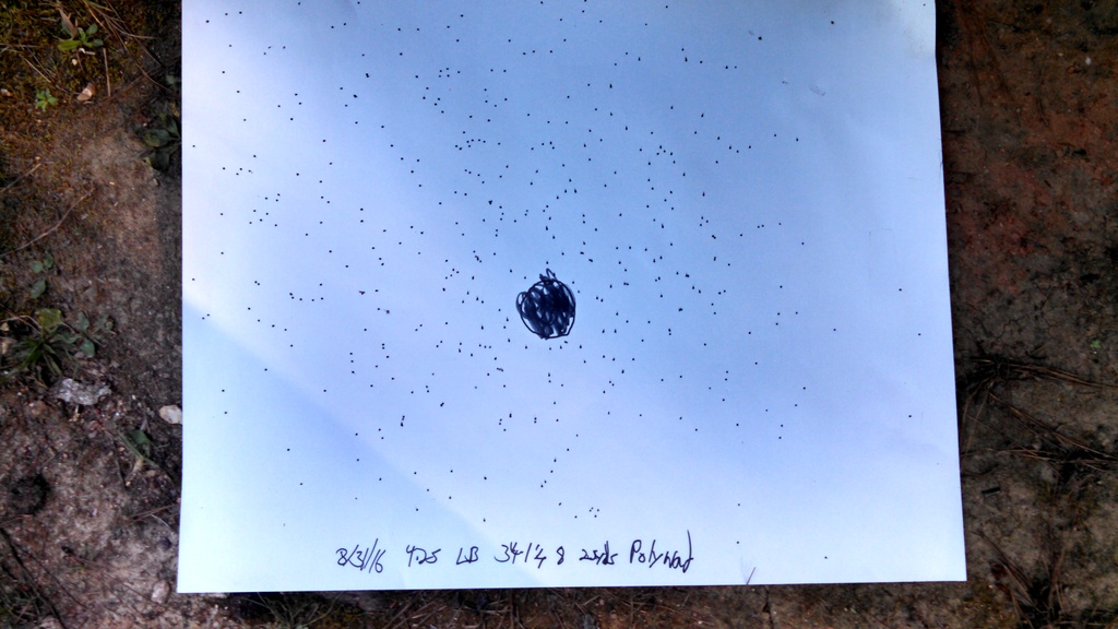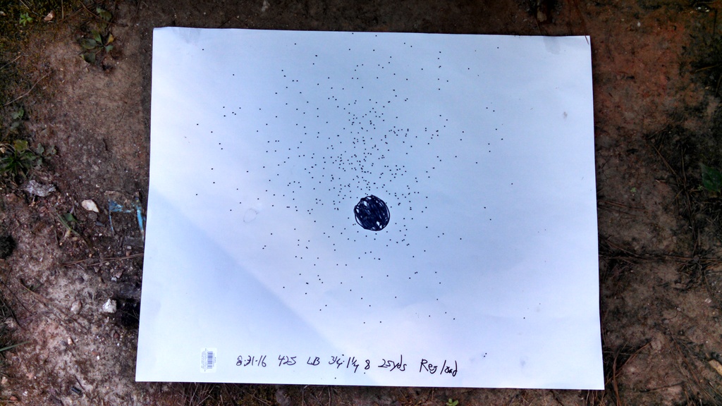Found a couple of pics to show before and after with the Polywad loads I made up a couple of years ago. These were both shot through the FC barrel of a Beretta 425. The first one is a regular load at 25 yards. There wouldn't be much dove left if you hit him with the center of this pattern: