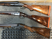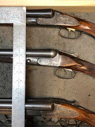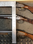 They all weigh different and all balance differently. The Parker balances dead on the hinge pin, the LC Smith ever so slightly ahead of the pin and the Lefever about an inch forward. Interesting to note the butts don't square off, the triggers don''t line up and the pistol grips don't line up. The top gun is a Lefever s(Krupp barrels) second is a Parker (damascus) and bottom a LC Smith (damascus).
