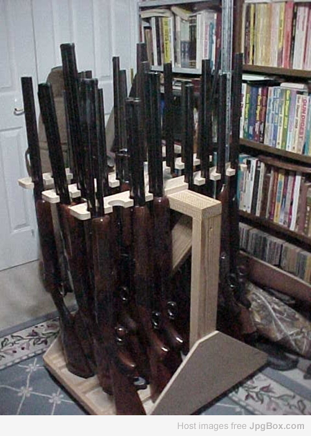 For some of the guns, I use a vertical rack with wheels In California, that rack in your home would make you a criminal, even if kept in a locked room. I know a lot of criminals.
