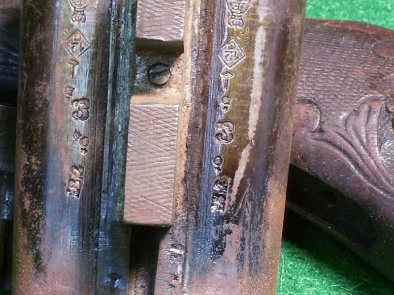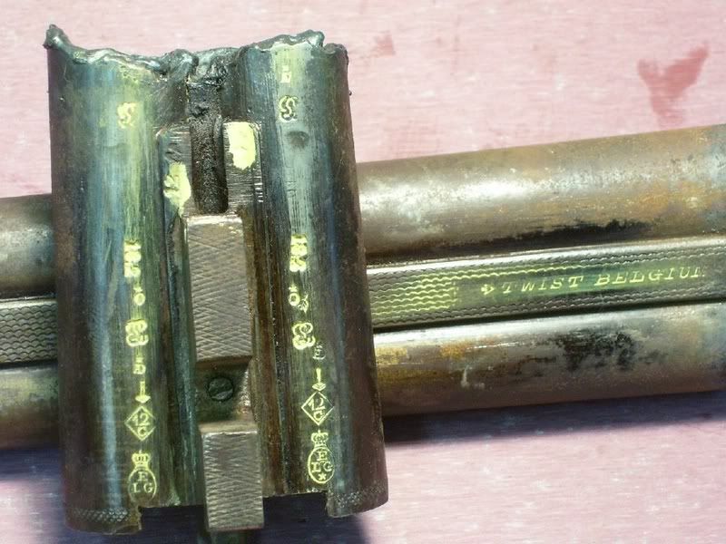 Here are a couple of more pictures. There are some letters (maybe insp. mark) near the torched end. they are (av) with what appear to be a star above it. On the barrels by the bottom rib are the letters (Luo) of what i believe is the importer. [img][/img]