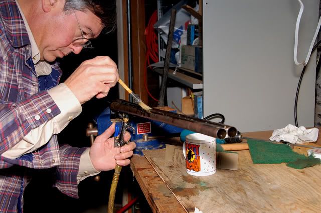 Drew, Another pic for the post. I leak checked the ribs with soapy water and pressurized the barrels by putting air in the hole I drilled in the short rib behind the forend lug and plugging the bead hole with the bead. I couldn't find any bubbles anywhere.