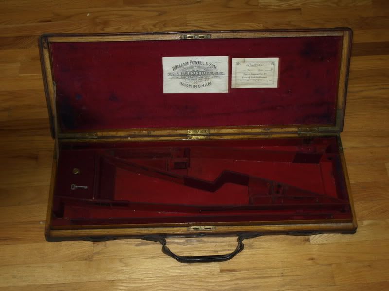 In the early 90's I traveled to England and by chance got to spend some time with some of the remaining craftsmen of the Birmingham trade. Apon leaving and as a gift, I was told by Mick Wagstaff to go to the attic and select an old case to take with me. This is the one I chose. I'm sure one time there was a lovely set of guns that went with it. Paul D. [img]  [/img] [img]  [/img]
