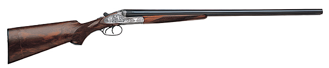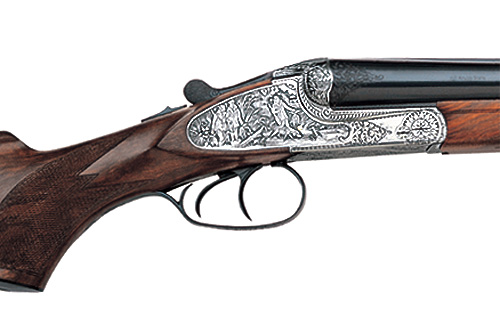 IWA EXPO Side By Side Shotgun 12 gauge with 28 inch barrels, modified/full, deep relief hunting scene engraved by Olaf Weiss, cheekpiece stock with swivels. Merkel side-by-side shotguns have an outstanding reputation for quality workmanship and have achieved a long historical tradition as elegant game guns. Merkel offers the most extensive variety of boxlock and sidelock models, and is one of the few manufacturers that continue to offer each side-by-side model in 16 gauge. All models are hand engraved, hand checkered and come with traditional features such as Greener cross-bolt locks, receiver ledges and sideclips. Cold hammer forged barrels are standard on all Merkel side-by-side shotguns and offer higher surface hardness that extend the life of the bores and chokes. Merkel's objective is to offer a combination of technical perfection, advanced design and aesthetic elegance by producing side-by-side shotguns that are handsome works of art that meet the most demanding requirements encountered in the field. Action: Locking Mechanism: Triggers: |